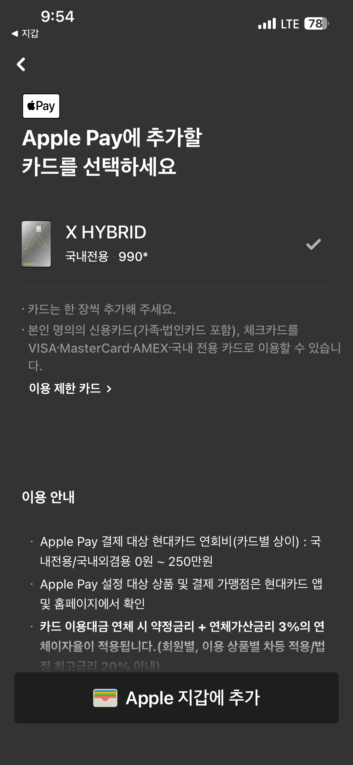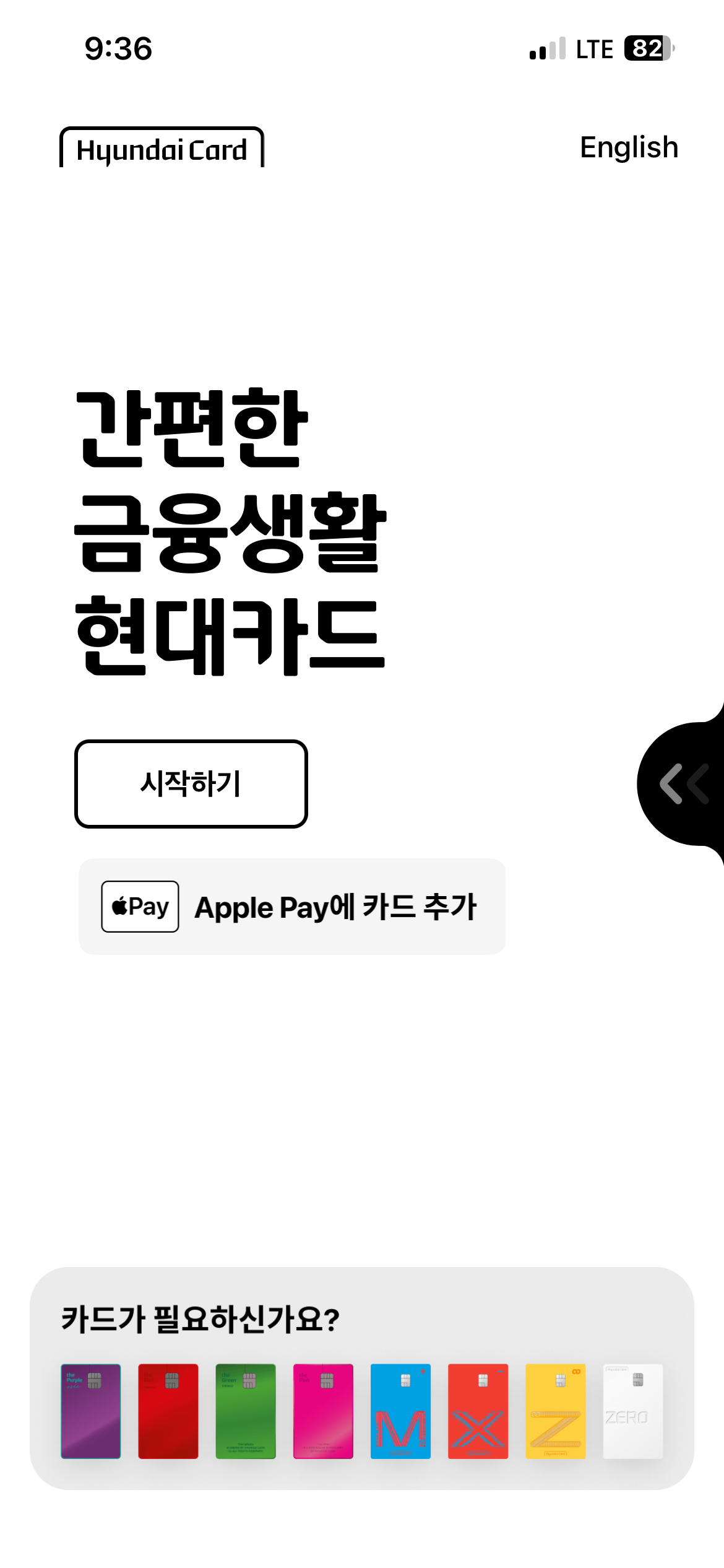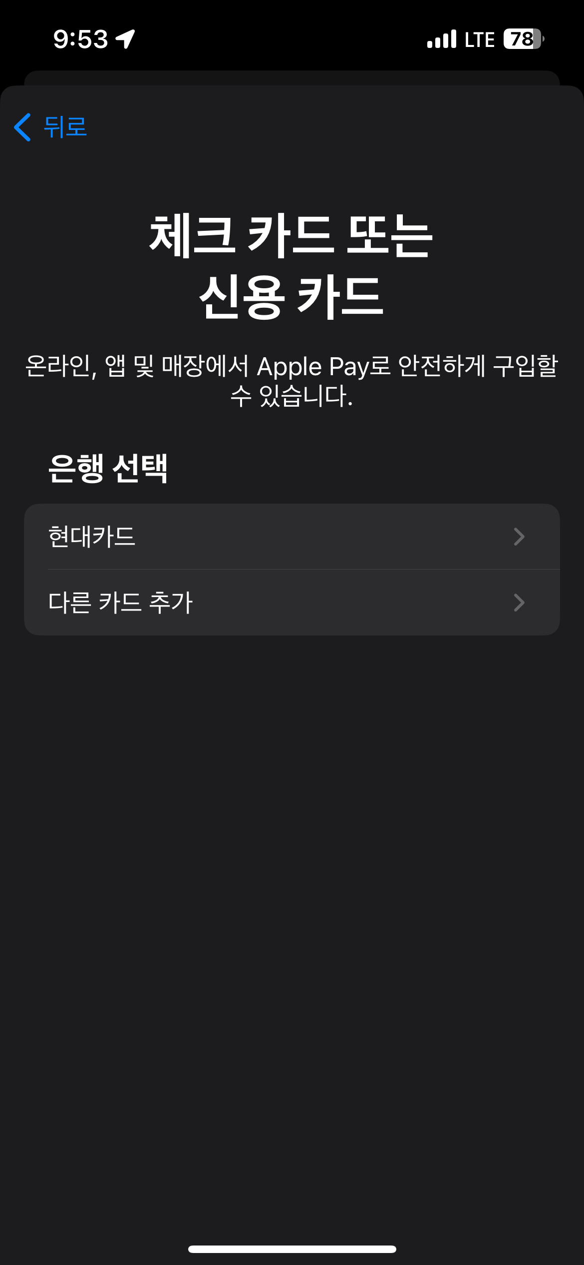 애플페이를 사용하기 위해서는 '현대카드'만 사용이 가능합니다.
