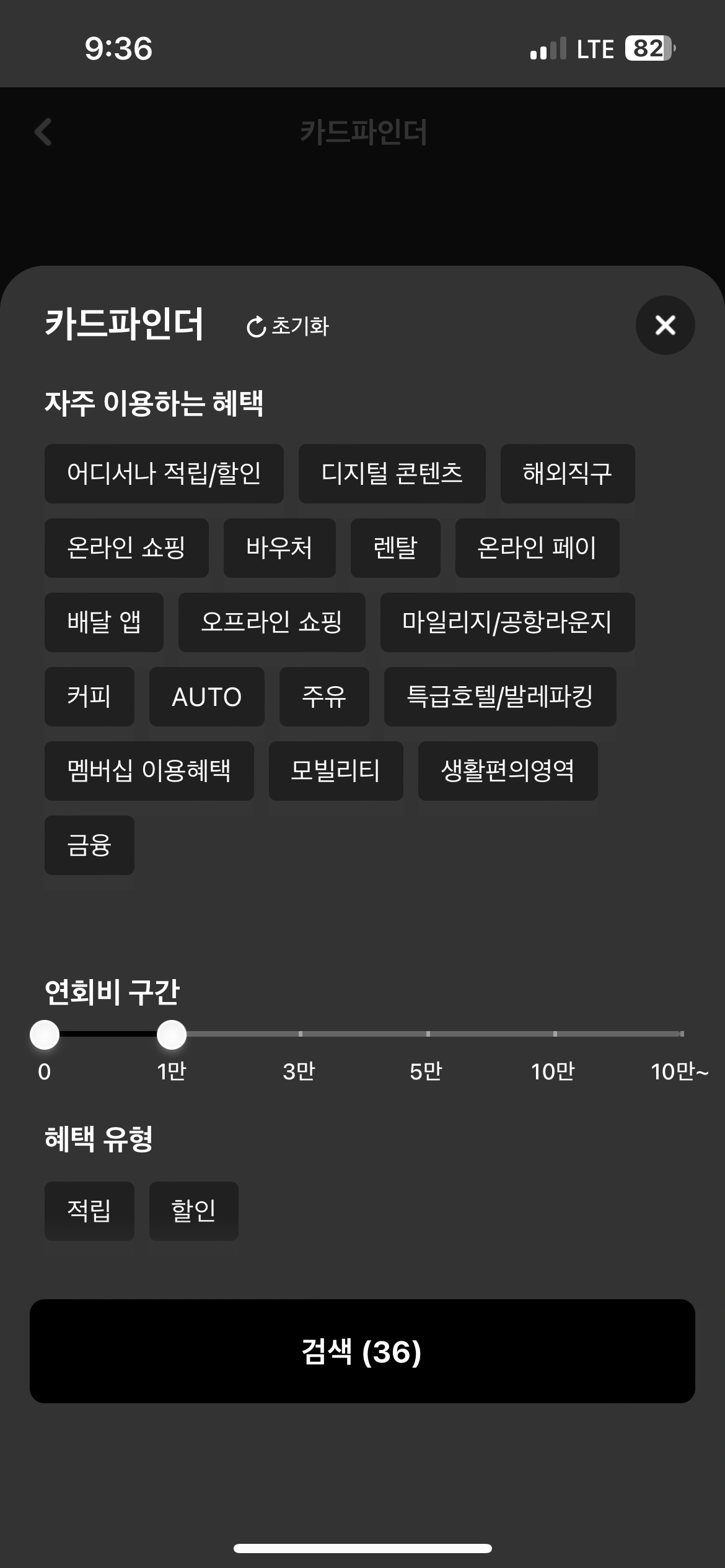 원하는 혜택, 연회비 구간을 선택한 후 '검색'을 해줍니다.